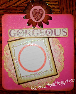 I received it in a swap and LOVE it! After adhering the lace only at the top of it, I added some pink ribbon, and a strand of pink flat-back pearls. I made the title with a carstock retangle, punched the corners, added an apoxy sicker, and went around it with some iamond stickles. I put some brass eyelets on each end.
